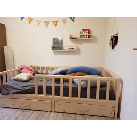Łóżeczko o wymiarach pod materac 150x70 cm w wersji naturalnej nie malowanej z barierkami dookoła oraz szufladą albo szufladami (do wyboru) i stelażem drewnianym