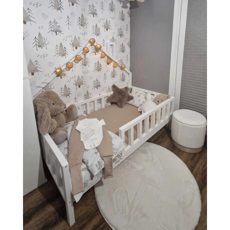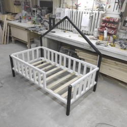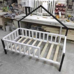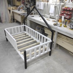 Łóżeczko PÓŁDOMEK o wymiarach pod materac 160x100 cm z białymi barierkami (kolor dowolny do wyboru) dookoła i stelażem drewnianym nie malowanym, reszta część łóżka normalnie nie malowana naturalne drewno (może być malowana wystarczy napisać przy zamówieniu)