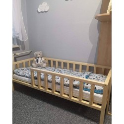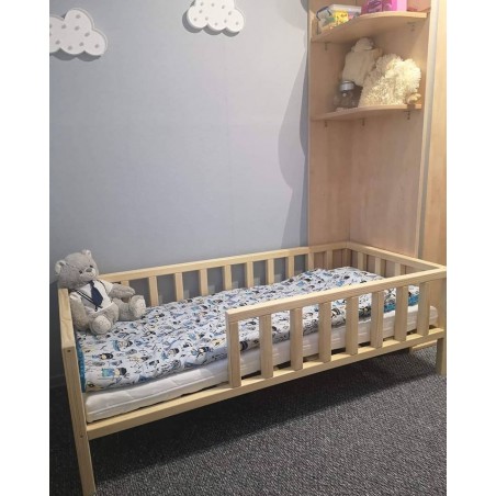 Łóżeczko o wymiarach pod materac 180x100 cm nie malowane z barierkami dookoła i stelażem drewnianym