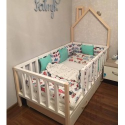 Łóżeczko o wymiarach pod materac 190x80 cm z malowanymi poziomymi barierkami (kolor dowolny do wyboru standardowo biały) dookoła oraz szufladą albo szufladami (do wyboru) i stelażem drewnianym nie malowanym, reszta część łóżka nie malowana naturalne drewno