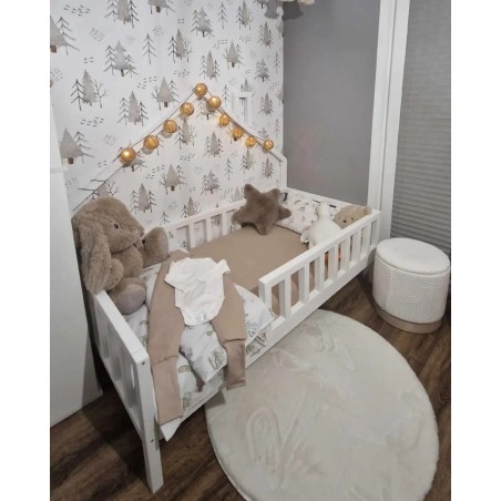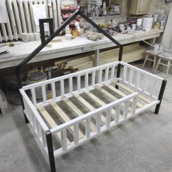 Łóżeczko PÓŁDOMEK o wymiarach pod materac 190x80 cm z białymi barierkami (kolor dowolny do wyboru) dookoła i stelażem drewnianym nie malowanym, reszta część łóżka normalnie nie malowana naturalne drewno (może być malowana wystarczy napisać przy zamówieniu)