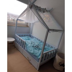 Łóżeczko DOMEK 3 o wymiarach pod materac 160x90 cm malowany standardowo na biało (kolor dowolny do wyboru) oraz szufladą albo szufladami (do wyboru) i stelażem drewnianym nie malowanym