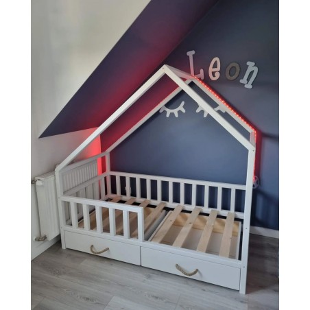 Łóżeczko DOMEK II o wymiarach pod materac 160x100 cm malowany standardowo na biało (kolor dowolny do wyboru) oraz szufladą albo szufladami (do wyboru) i stelażem drewnianym nie malowanym